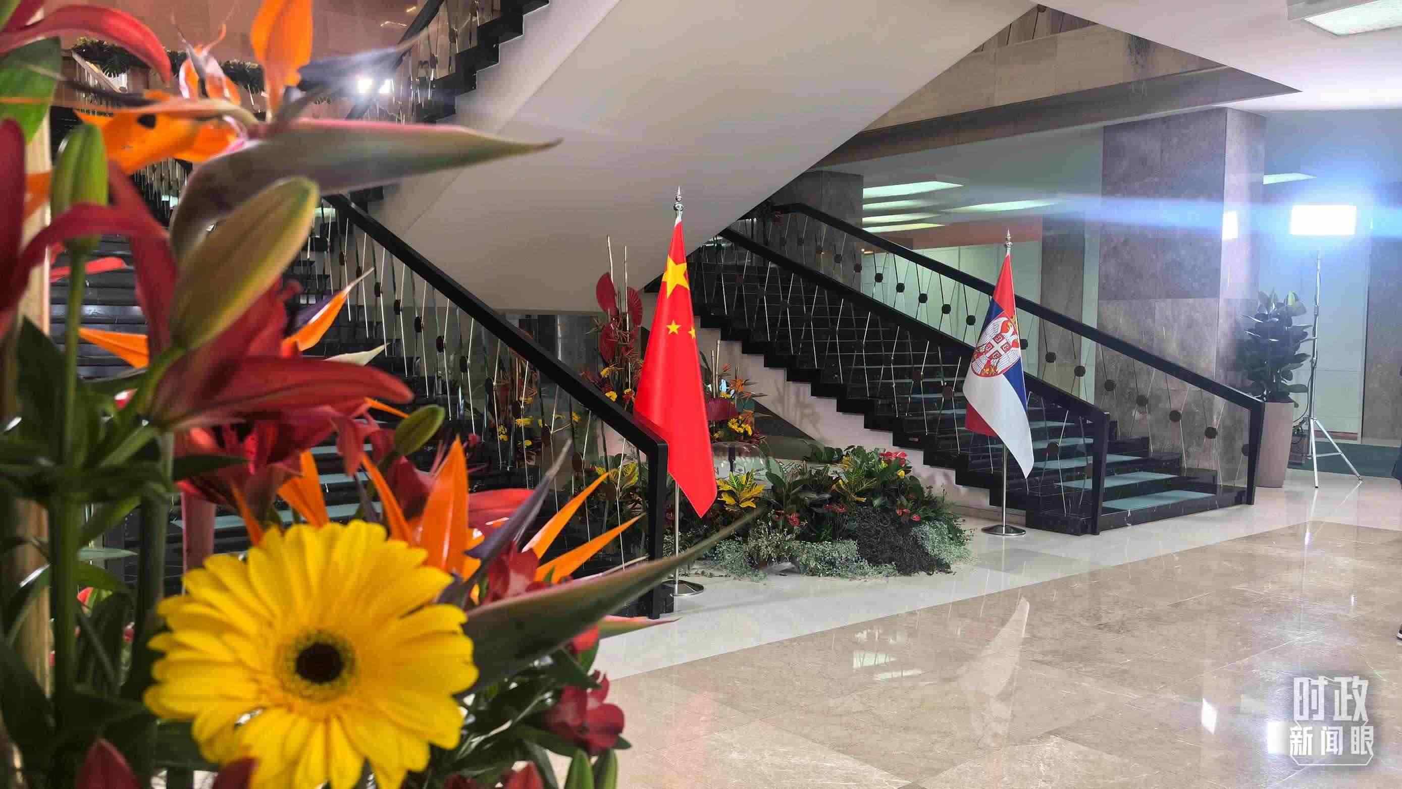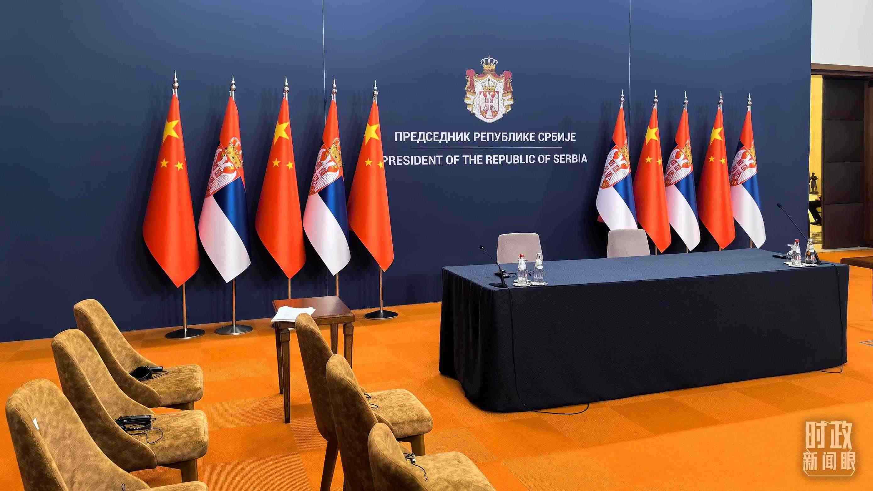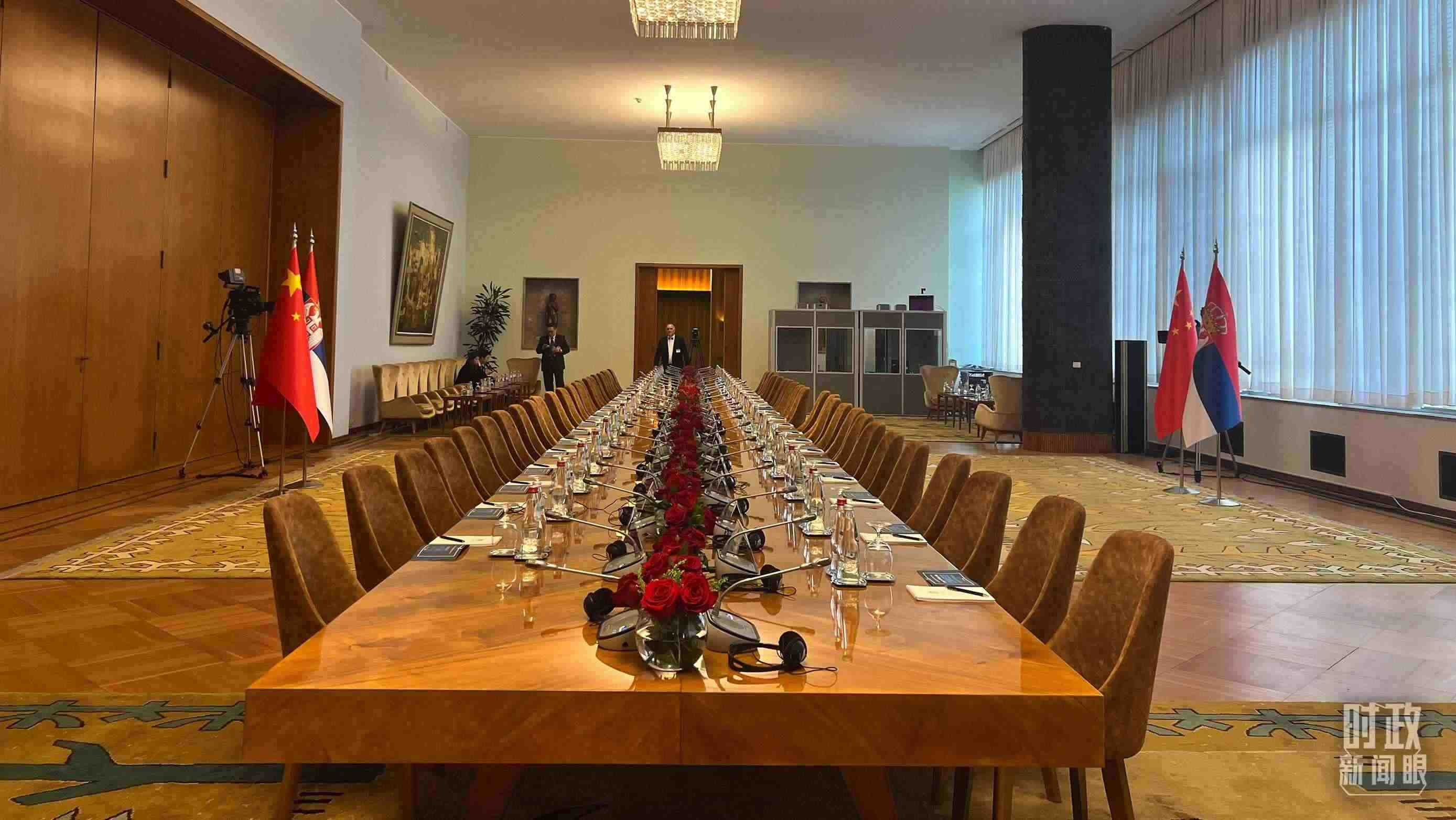 △5月8日上午,習主席同武契奇總統(tǒng)舉行大范圍會談,這是會談開始前的現(xiàn)場。(總臺央視記者張洛嘉拍攝)