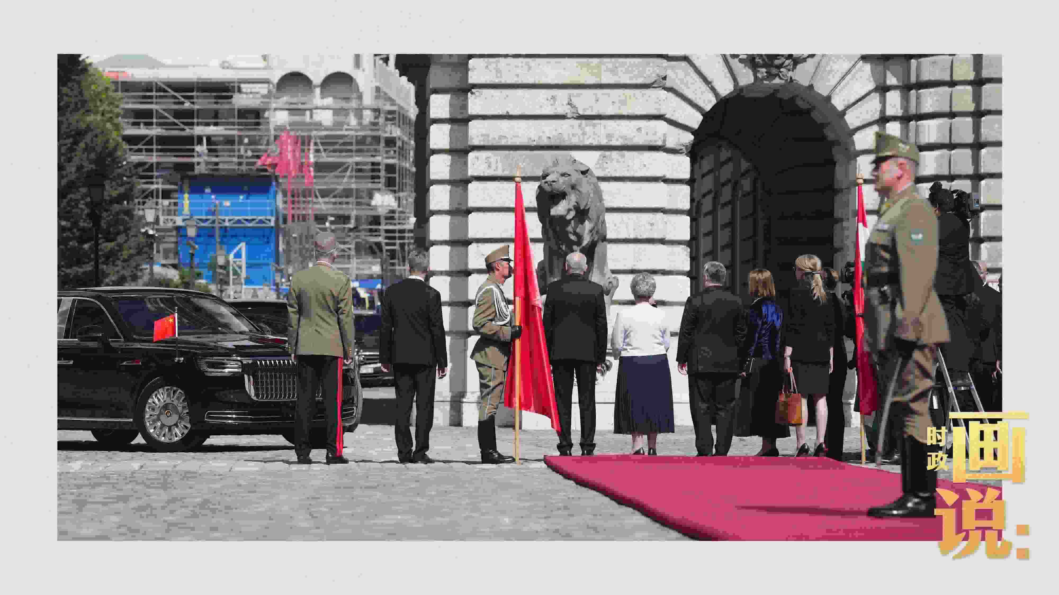 △習(xí)近平主席乘車抵達(dá)布達(dá)王宮,舒尤克總統(tǒng)夫婦和歐爾班總理夫婦在習(xí)主席下車處提前等候,熱情迎接。