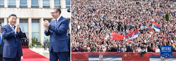 當?shù)貢r間5月8日上午,國家主席習近平在貝爾格萊德塞爾維亞大廈同塞爾維亞總統(tǒng)武契奇舉行會談。會談前,武契奇陪同習近平來到政府大廈平臺(左圖)。大廈廣場上,一萬五千名塞爾維亞民眾揮舞中塞兩國國旗,對習近平表示最熱烈的歡迎(右圖)。(拼版照片) 新華社記者 黃敬文 丁海濤 攝