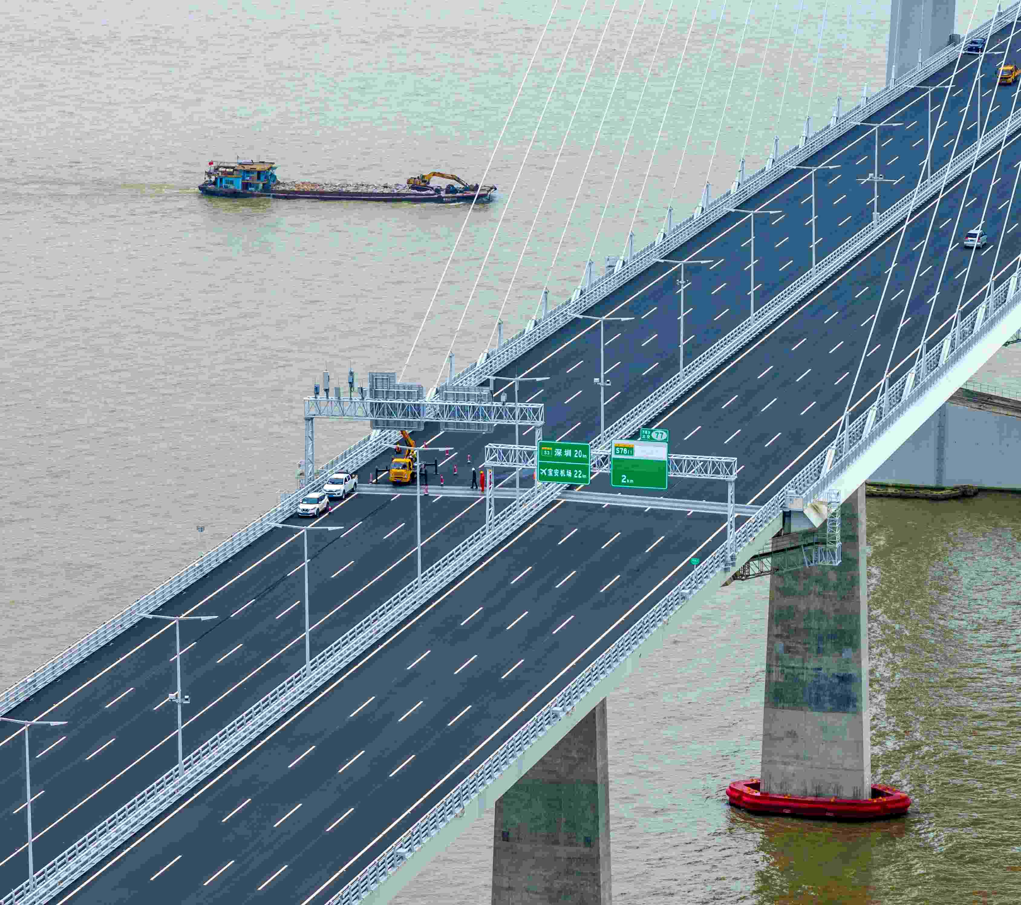 △2024年6月30日,深圳至中山跨江通道建成開通。這是通車前工人在做最后的檢修和裝飾。
