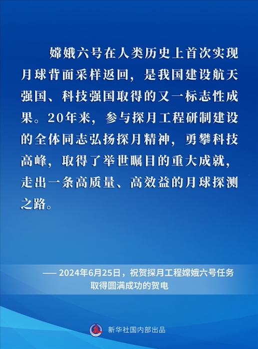黨的十八大以來,在以習(xí)近平同志為核心的黨中央關(guān)心引領(lǐng)下,中國探月工程取得舉世矚目的重大成就,為探索宇宙奧秘、增進(jìn)人類福祉屢立新功,為以中國式現(xiàn)代化全面推進(jìn)強(qiáng)國建設(shè)、民族復(fù)興偉業(yè)作出卓越貢獻(xiàn)。