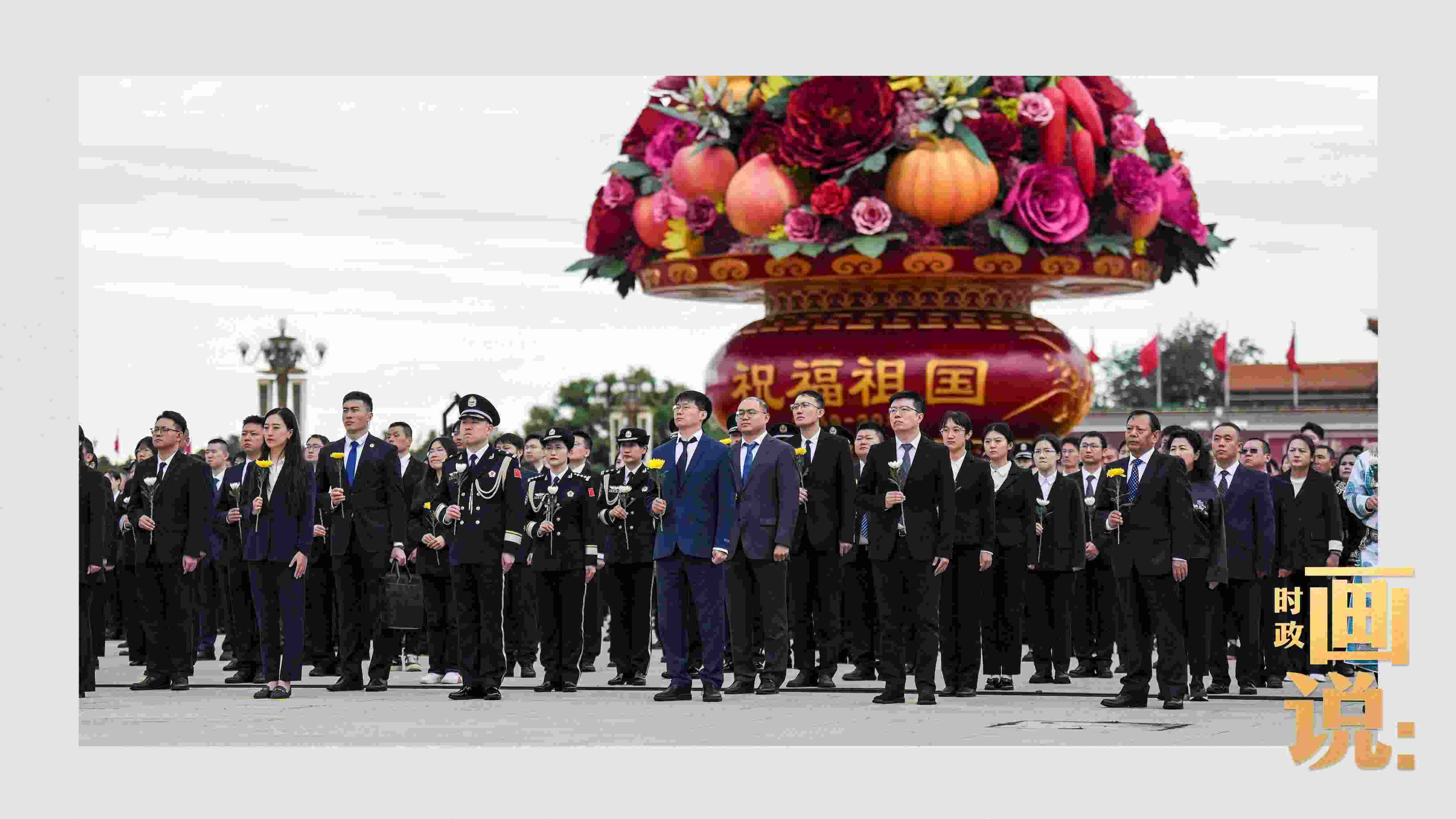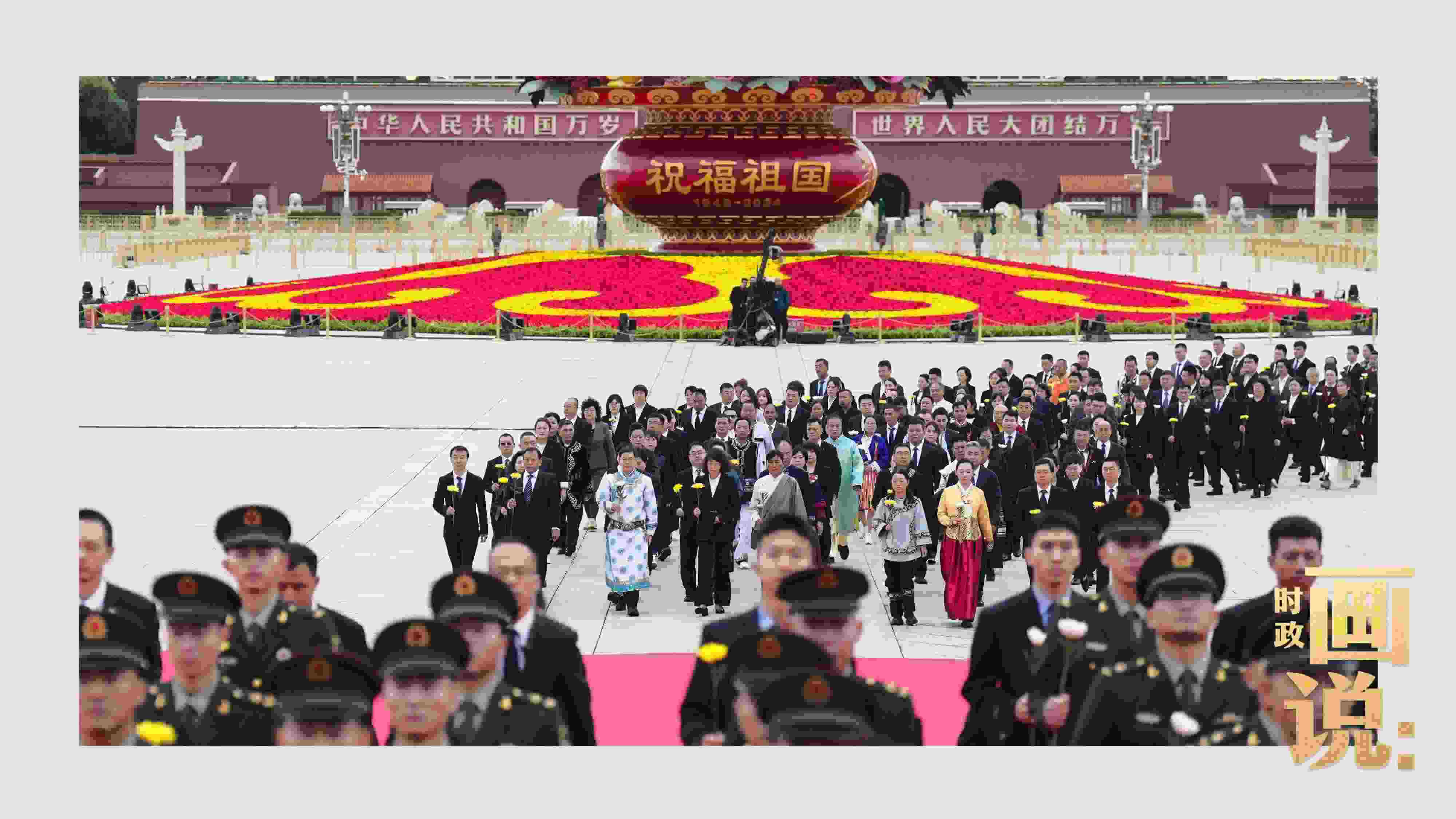 △天安門廣場中央,“祝福祖國”巨型花籃表達著對國家繁榮富強的美好祝福。