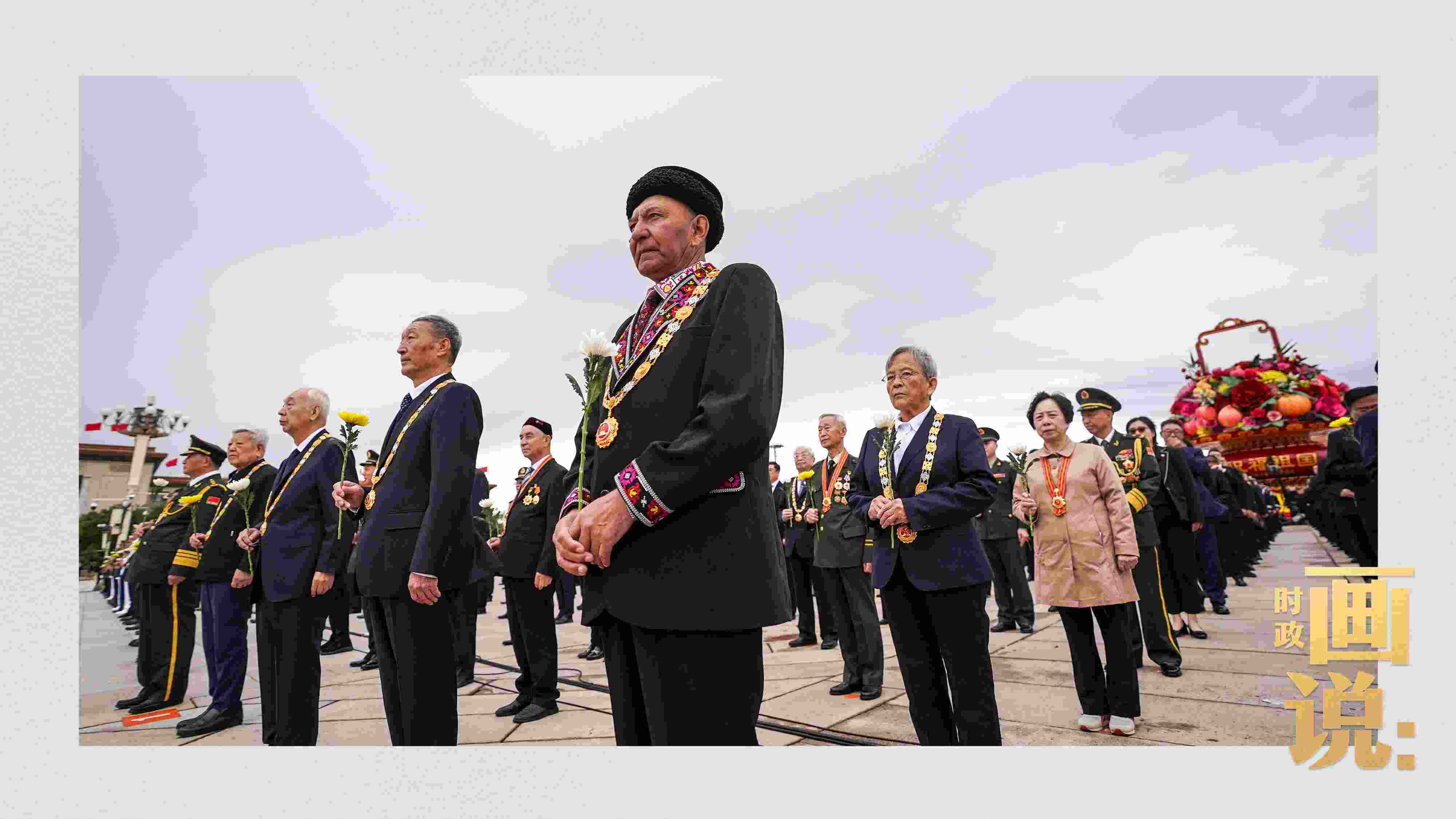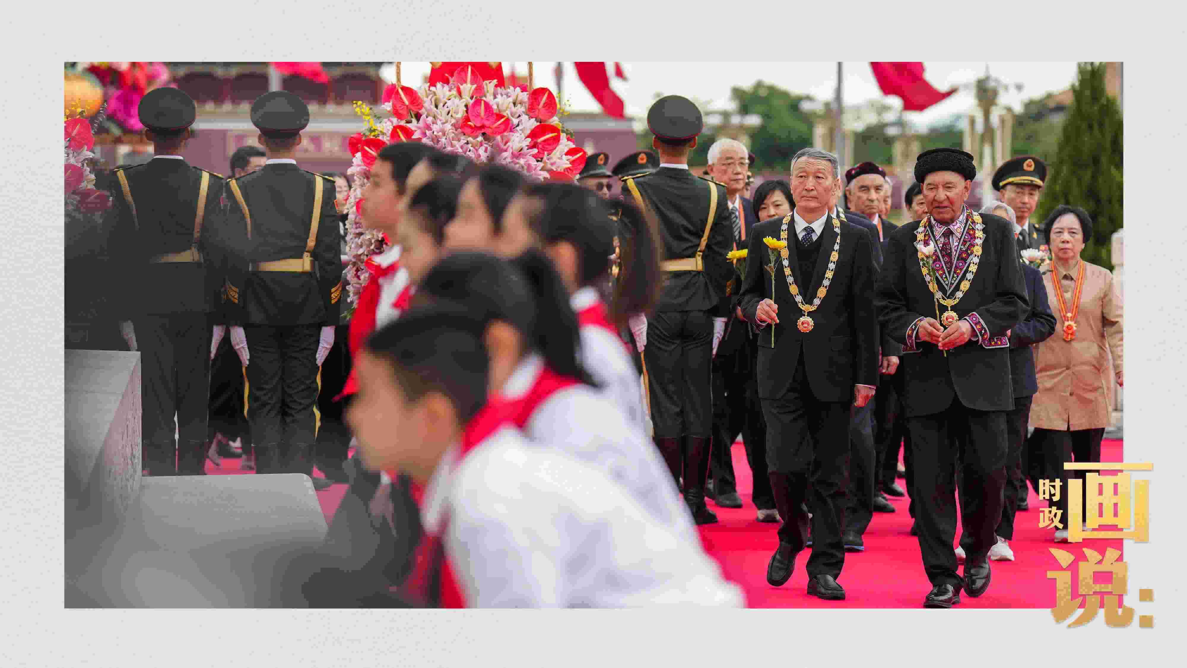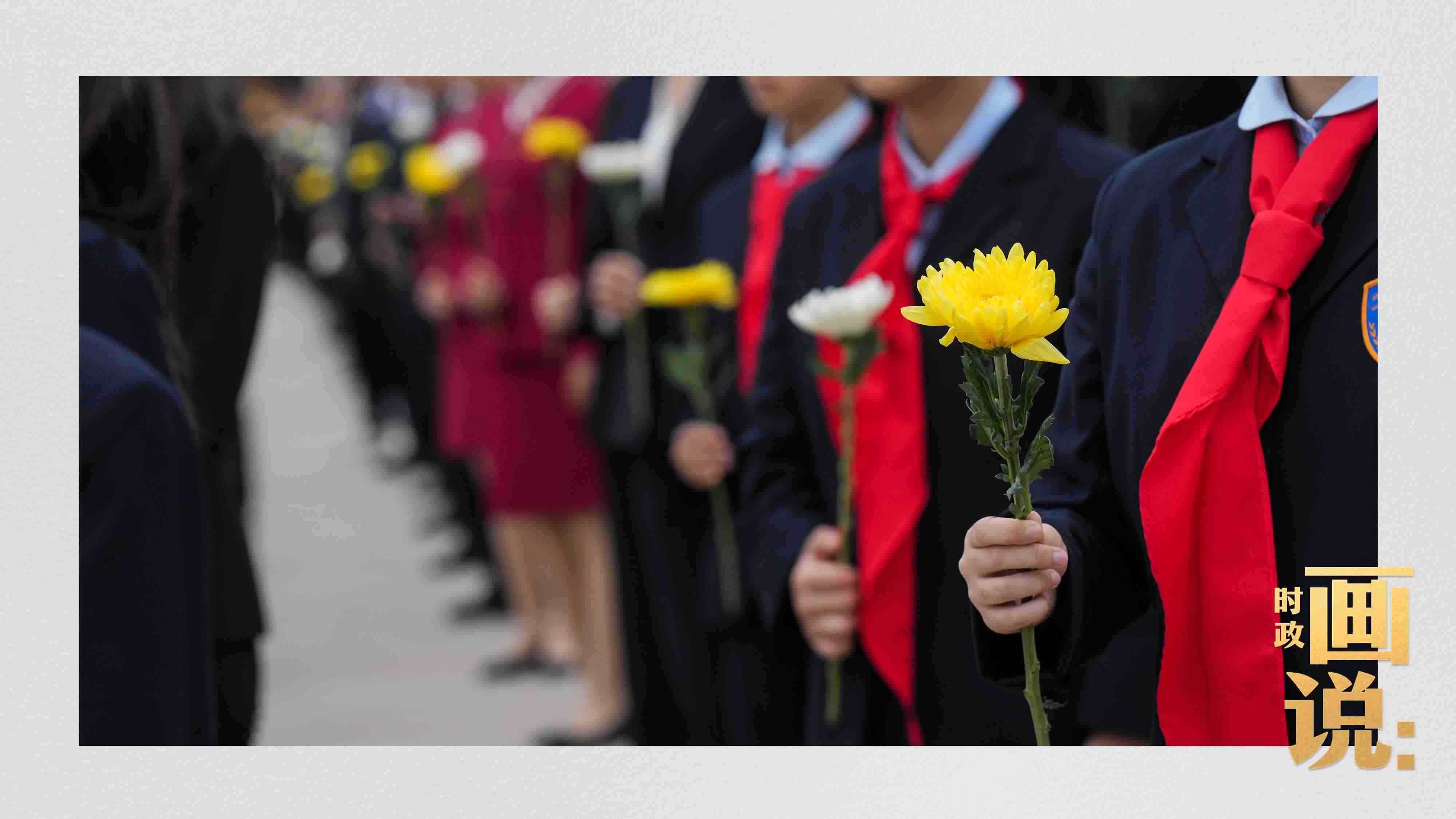 △少年兒童和各界代表依次走到紀(jì)念碑前,獻上手中鮮花并瞻仰紀(jì)念碑。