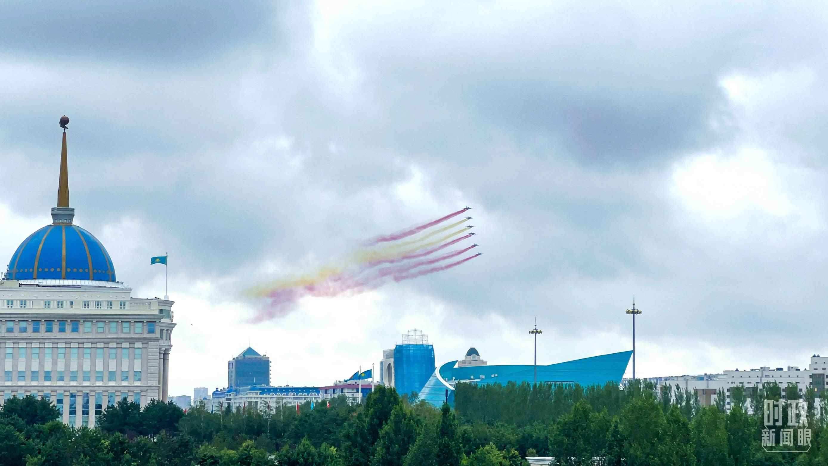 習主席乘車抵達哈總統(tǒng)府時,托卡耶夫總統(tǒng)熱情迎接。六架哈薩克斯坦空軍戰(zhàn)機從總統(tǒng)府上空飛過,拉出象征中國國旗色彩的紅黃色彩煙,以最高禮儀歡迎中國貴賓。