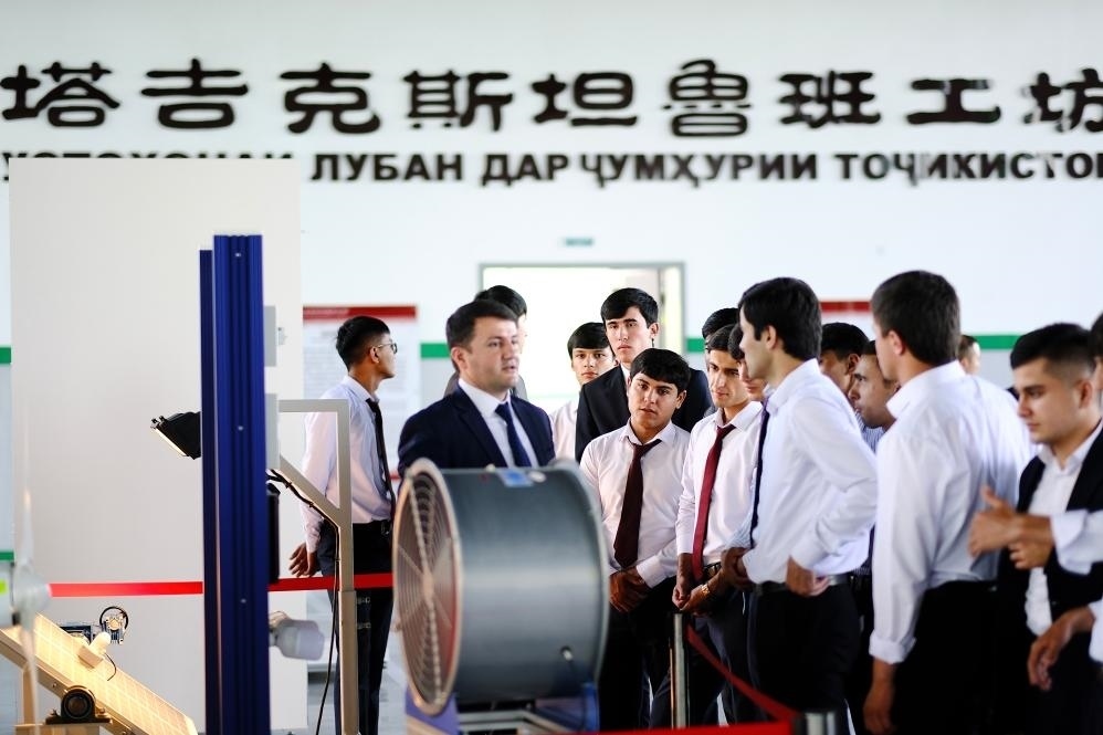 6月14日,在塔吉克斯坦首都杜尚別,學(xué)生們在魯班工坊內(nèi)聽老師講解。