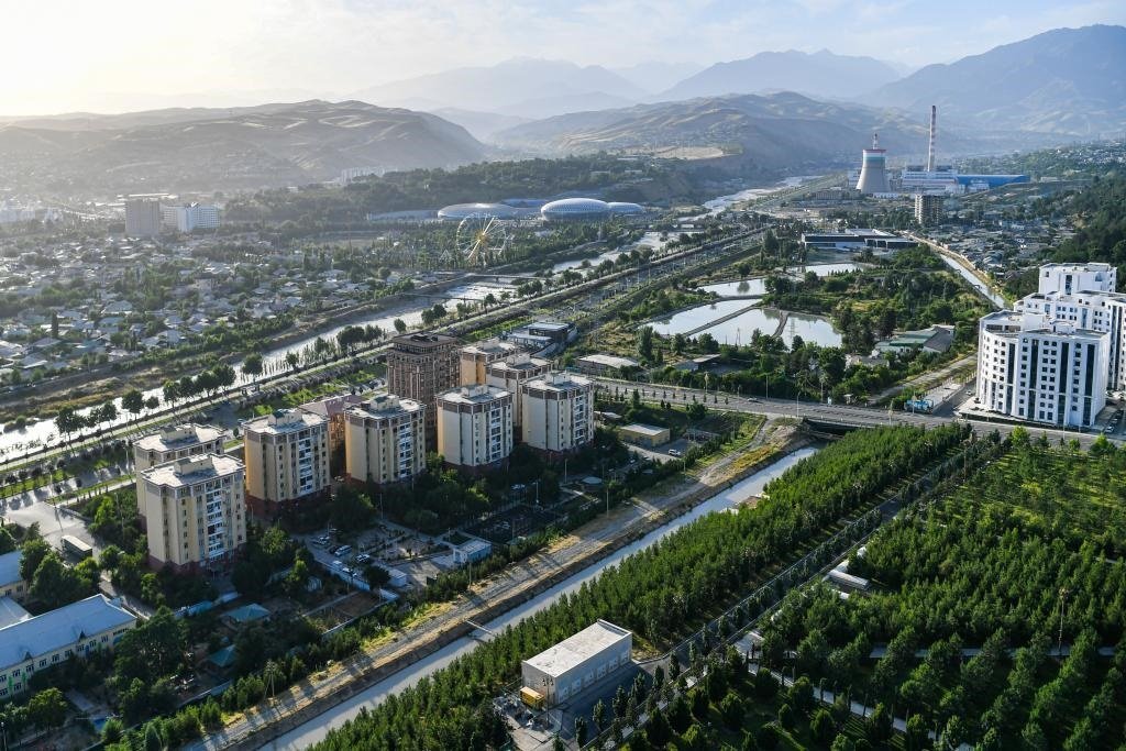 6月26日,從獨立與自由塔上眺望,奔騰的瓦爾佐布河穿城而過,杜尚別城市風光盡入眼簾。