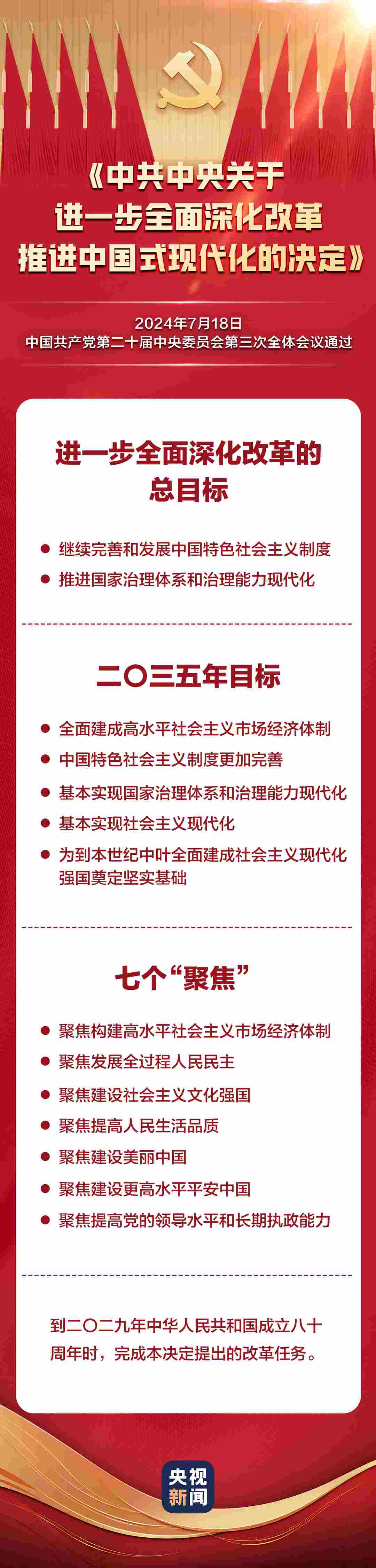 中國(guó)共產(chǎn)黨第二十屆中央委員會(huì)第三次全體會(huì)議,于2024年7月15日至18日在北京舉行。全會(huì)最重要的成果是審議通過(guò)《中共中央關(guān)于進(jìn)一步全面深化改革、推進(jìn)中國(guó)式現(xiàn)代化的決定》。《決定》共15部分、60條,分三大板塊,一文速覽: