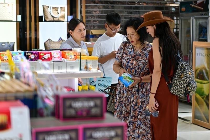 △2024年7月26日,在中哈霍爾果斯國(guó)際邊境合作中心,游客在免稅店挑選商品。今年以來(lái),新疆各大旅游目的地游客量持續(xù)攀升。