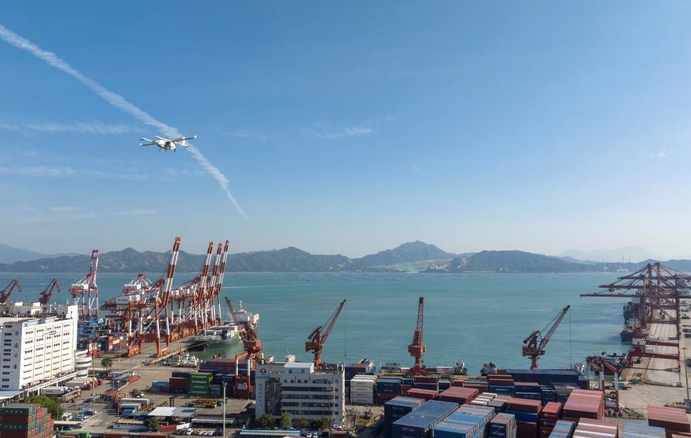 △無人機搭載快件從珠海飛抵深圳蛇口集裝箱碼頭起降點。
