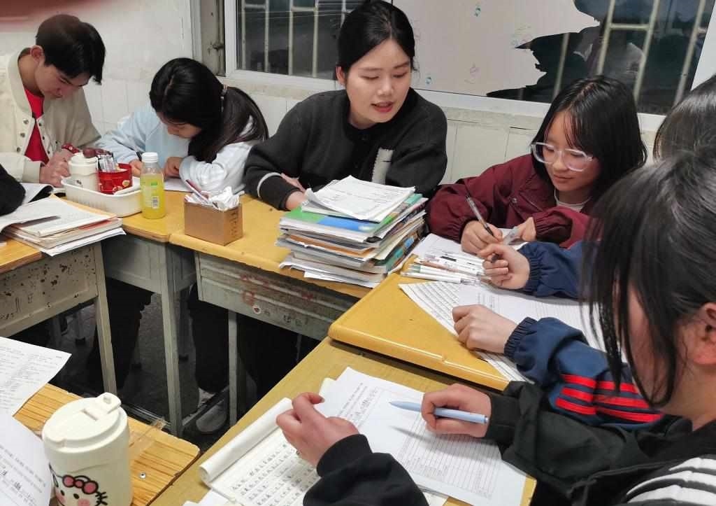 2024年4月21日,云南昭通大關(guān)一中教師劉雪瑤(左三)在輔導學生做作業(yè)。(李龍強 攝)