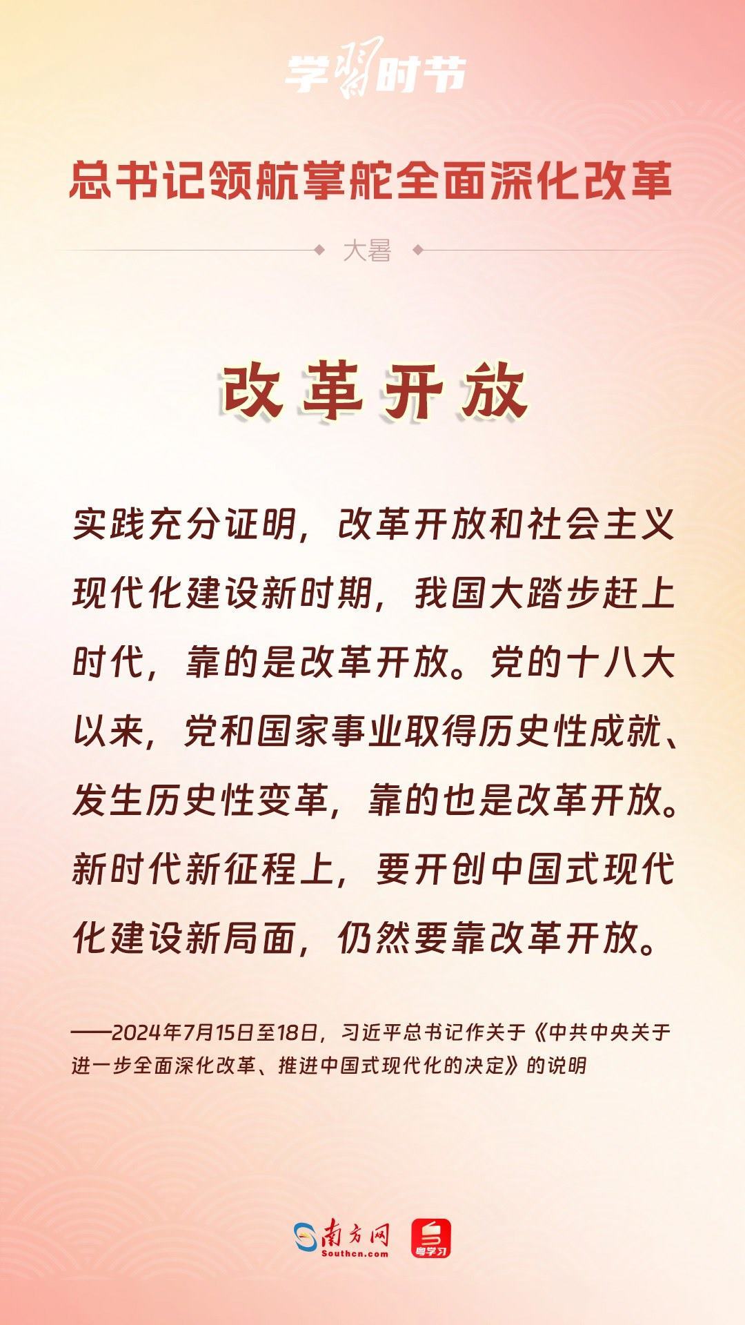 我們隆重慶祝新中國成立75周年,深情回望共和國的滄桑巨變。從五千多年中華文明的傳承中一路走來,“中國”二字鐫刻在“何尊”底部,更銘刻在每個華夏兒女心中。黨的二十屆三中全會勝利召開,吹響進一步全面深化改革的號角。我們乘著改革開放的時代大潮闊步前行,中國式現(xiàn)代化必將在改革開放中開辟更加廣闊的前景。