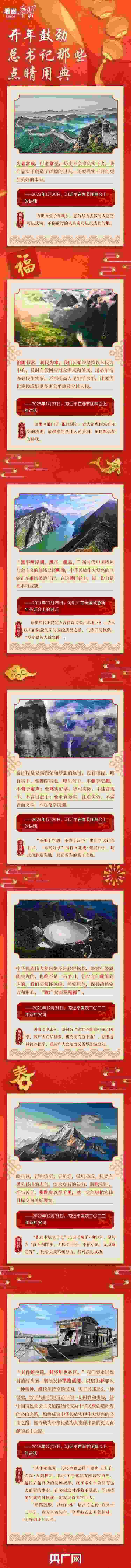 “犯其至難而圖其至遠”“積跬步以至千里”“為者常成,行者常至,歷史不會辜負實干者”……每逢歲末年初,習近平總書記都會發(fā)表重要講話,為大家送祝福、鼓干勁。在這些重要講話中,總書記時常引經(jīng)據(jù)典、援古論今,為中華傳統(tǒng)詩文典故賦予鮮活的新時代內(nèi)涵。一年之計在于春,讓我們一起重溫總書記那些點睛用典,共同開啟新的篇章。
