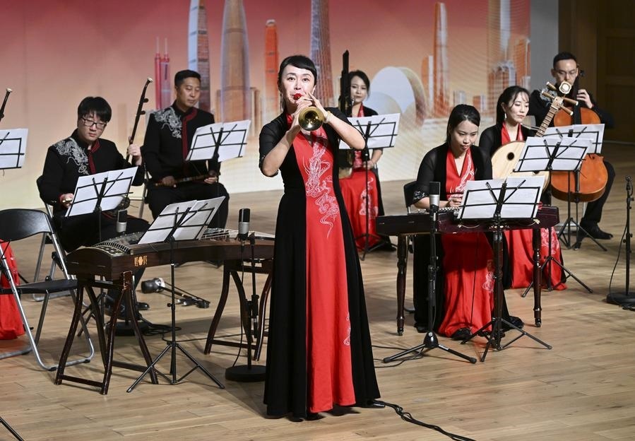 2023年11月24日,在馬來西亞雪蘭莪州的廈門大學馬來西亞分校,藝術(shù)家在音樂會上演奏?!敖z路粵韻——廣東民族音樂會”當晚在廈門大學馬來西亞分校舉辦。新華社記者程一恒攝