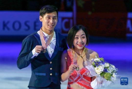 2017年3月30日,隋文靜(右)/韓聰在芬蘭赫爾辛基舉行的2017年花樣滑冰世錦賽雙人滑比賽頒獎(jiǎng)儀式上。新華社發(fā)(馬蒂凱寧攝)