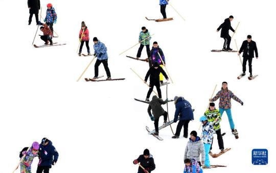 這是人們?cè)诎⒗仗┦袑④娚交﹫?chǎng)參加毛皮滑雪慶?;顒?dòng)(2019年1月16日攝)。新華社記者 沙達(dá)提 攝