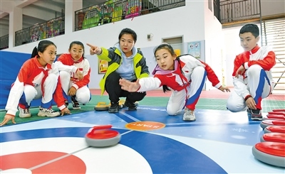 呼和浩特市賽罕區(qū)錫林南路小學(xué)分校學(xué)生體驗(yàn)旱地冰壺運(yùn)動(dòng)。記者 王磊 攝
