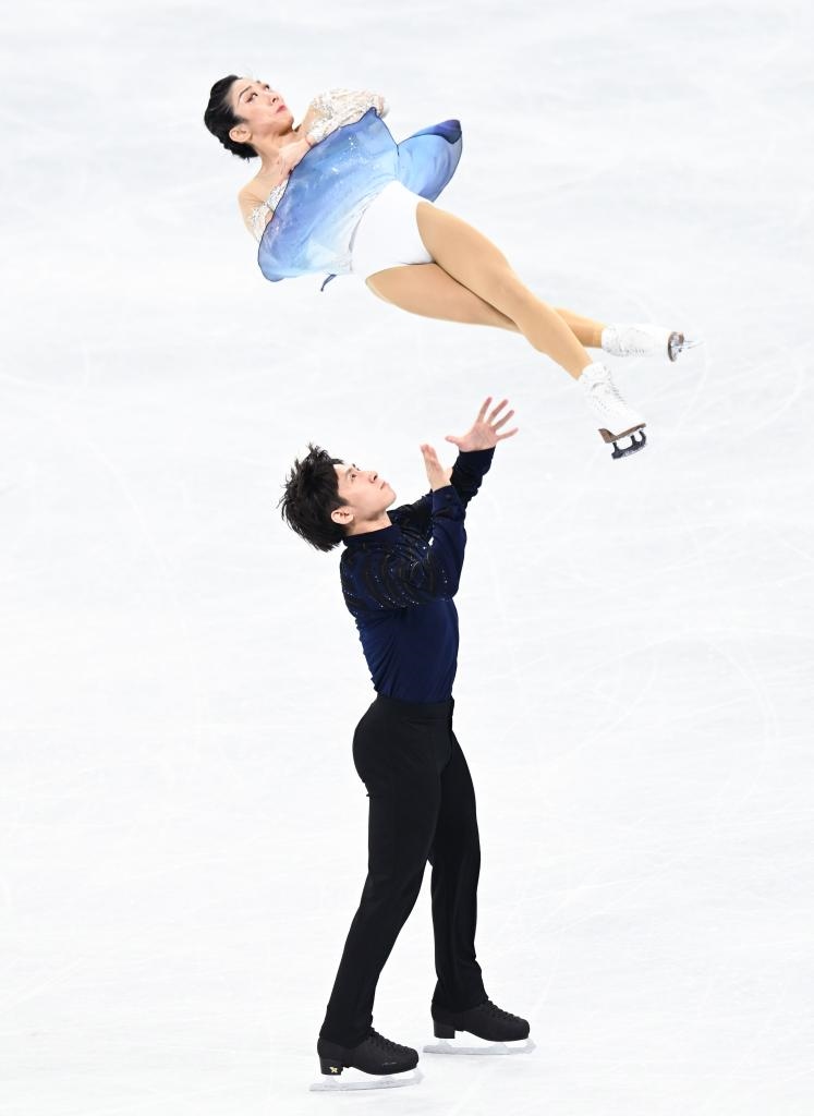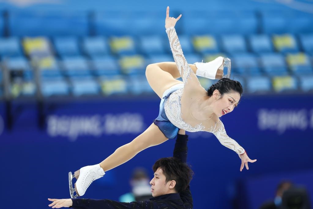 2月19日,中國(guó)選手隋文靜(上)/韓聰在比賽中。新華社記者李尕?cái)z