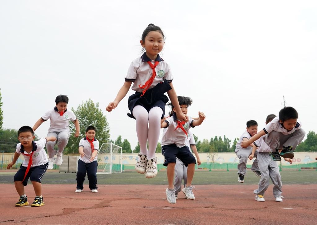 6月27日,在北京第二實(shí)驗(yàn)小學(xué)平谷分校,二年級(2)班的學(xué)生上體育課。新華社記者任超攝