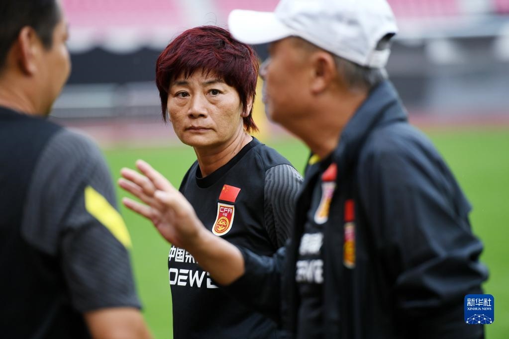7月12日,主教練水慶霞(中)在訓(xùn)練中聽取教練組匯報(bào)。新華社記者 李紫恒 攝