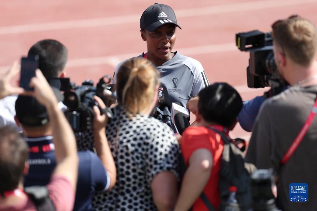 11月18日,盧旺達(dá)女主裁穆坎桑加(后)在訓(xùn)練前接受采訪(fǎng)。本屆世界杯將首次出現(xiàn)由女主裁執(zhí)法比賽。新華社記者 賈浩成 攝