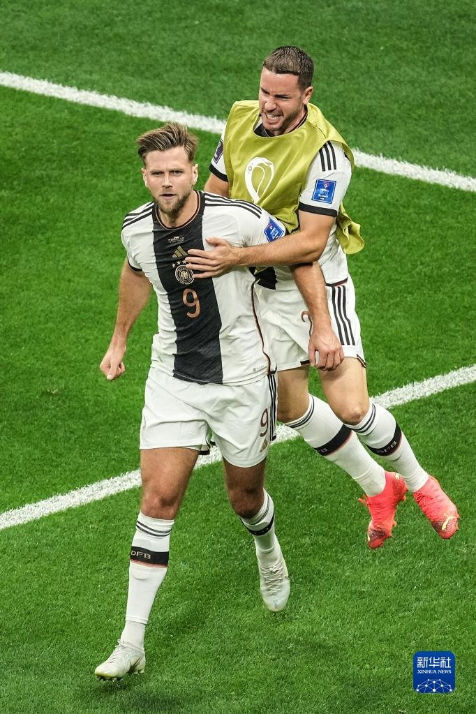 11月27日,德國隊球員尼克拉斯·菲爾克魯格(左)在比賽中進(jìn)球后與隊友慶祝。新華社記者 潘昱龍 攝