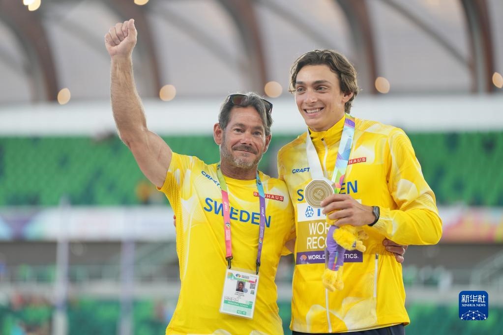 這是2022年7月24日,杜普蘭蒂斯(右)在俄勒岡田徑世錦賽男子撐桿跳高頒獎(jiǎng)儀式上和父親兼教練格雷戈里合影。新華社記者 吳曉凌 攝