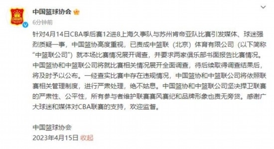 CBA聯(lián)賽官方微博15日凌晨發(fā)布消息表示:針對(duì)4月14日2022-2023賽季CBA聯(lián)賽季后賽12進(jìn)8、上海久事隊(duì)與蘇州肯帝亞隊(duì)比賽引發(fā)媒體、球迷強(qiáng)烈質(zhì)疑一事,中籃聯(lián)(北京)體育有限公司(以下簡稱“中籃聯(lián)公司”)高度重視,已就本場比賽情況展開調(diào)查,中國籃協(xié)也在第一時(shí)間責(zé)成中籃聯(lián)公司查明情況。中籃聯(lián)公司待后續(xù)取得調(diào)查結(jié)果后,將及時(shí)予以發(fā)布。