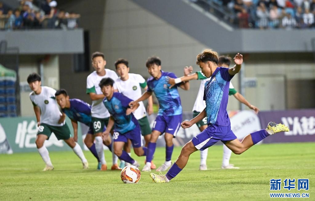 ??6月15日,浙江俱樂部U21隊(duì)球員王鈺棟(前右)在比賽中主罰點(diǎn)球得分。