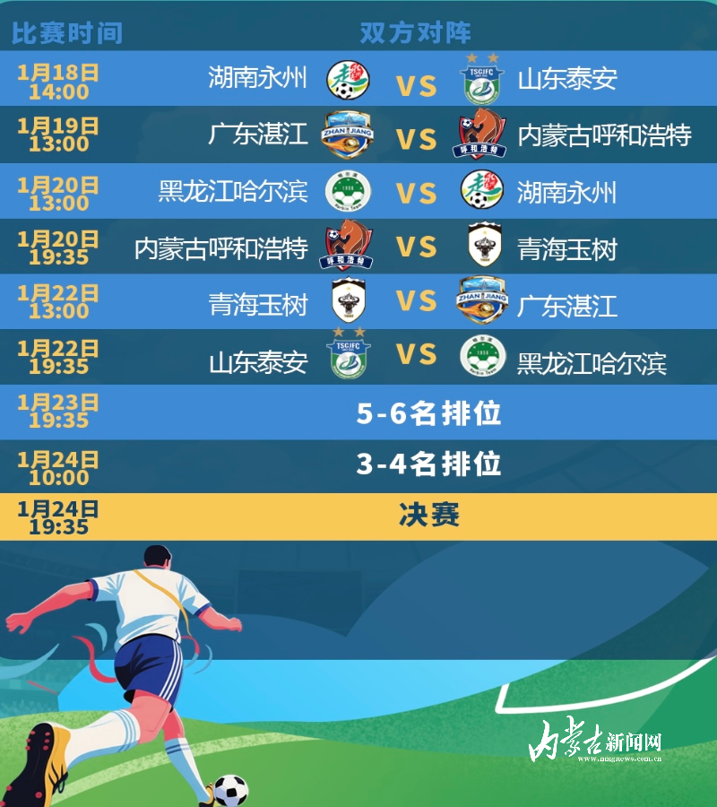 群眾足球風(fēng)云再起,一場(chǎng)匯聚南北、融合競(jìng)技與文化的群眾足球盛宴即將激情上演。1月18日至1月24日,CMG群眾足球邀請(qǐng)賽將在湖南省永州市拉開(kāi)帷幕。1月11日晚,抽簽結(jié)果正式揭曉,呼和浩特隊(duì)將于1月19日首戰(zhàn)粵超冠軍廣東湛江隊(duì)。球隊(duì)將于1月16日啟程,在永州進(jìn)行合練。