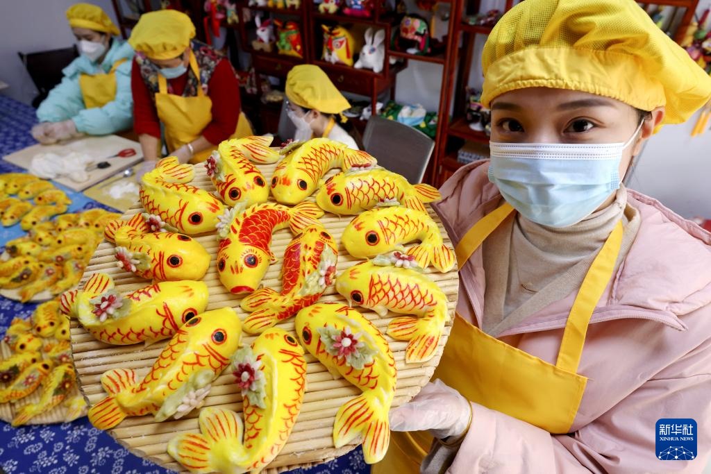 1月13日,山東省棗莊市龍山路街道居民在展示制作的傳統(tǒng)“面魚”。新華社發(fā)(孫中喆 攝)
