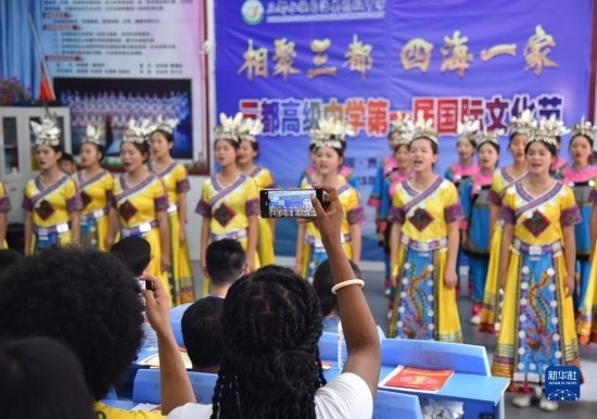 6月5日,來華留學生觀看三都高級中學學生演唱的水族語言歌曲《水歌》。
