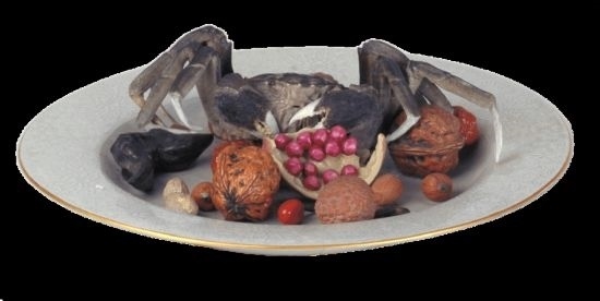 清乾隆·粉彩像生瓷果品盤。盤中諸果品不但酷似實(shí)物,而且都具有吉祥含義,如螃蟹寓意“一甲”,即科舉殿試第一;荔枝樹(shù)有“經(jīng)四百余年猶能結(jié)實(shí)者”之說(shuō),象征長(zhǎng)壽;核桃、石榴是多子多福的象征;而棗、花生、瓜子等則寓意“早生貴子”。(圖片來(lái)源:故宮博物院)