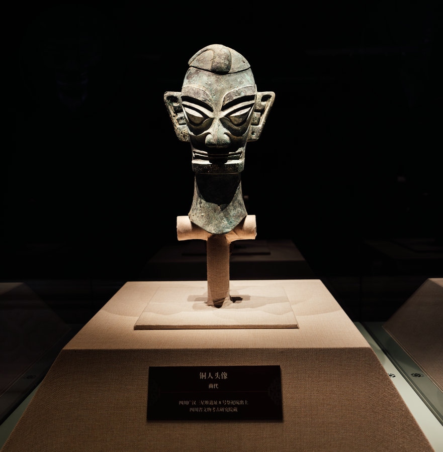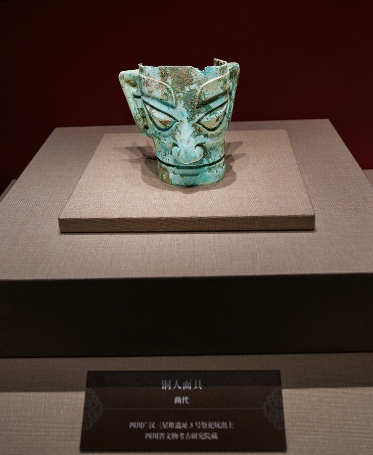 來自四川廣漢三星堆遺址出土的文物引人關注,三星堆展品共5件,銅人頭像、銅人面具、銅頂尊跪坐人像肩部龍形裝飾、銅跪坐人像4件真品,銅縱目面具1件復制品。