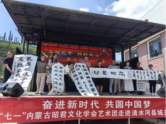 據(jù)了解,本次進(jìn)社區(qū)活動(dòng)由內(nèi)蒙古昭君文化學(xué)會(huì)、清水河縣城關(guān)鎮(zhèn)政府、昆新社區(qū)主辦,活動(dòng)以“鑄牢中華民族共同體意識(shí),構(gòu)筑中華民族共有精神家園”和慶祝中國共產(chǎn)黨建黨103周年為主旨,以書法、歌舞等群眾喜聞樂見的藝術(shù)形式,歌頌中國共產(chǎn)黨帶領(lǐng)全國各族人民守望相助、團(tuán)結(jié)奮斗砥礪前行的光輝歷程以及取得的偉大成就,真情詮釋不忘初心,牢記使命的責(zé)任擔(dān)當(dāng)。
