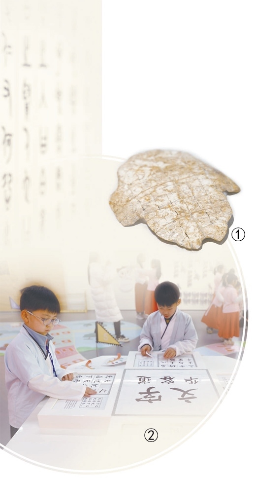 圖①:中國文字博物館館藏的卜甲。 丁俊豪攝(影像中國) 圖②:學生在博物館體驗“文字華容道”游戲。楊少甜攝