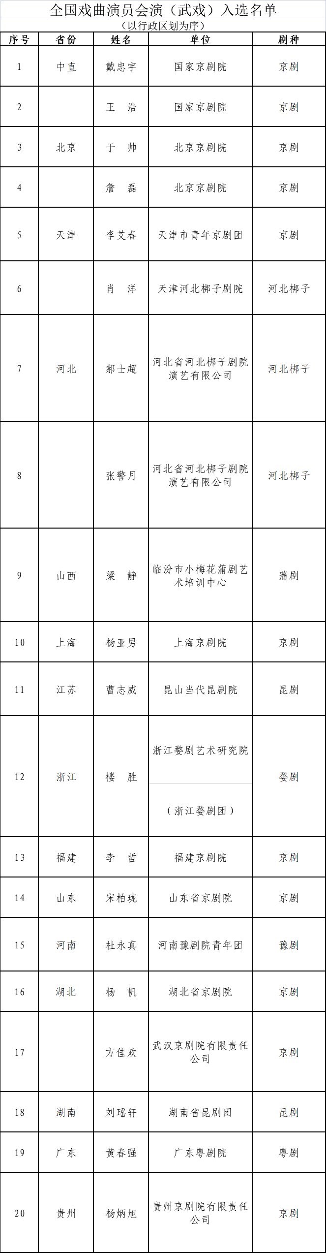 人民網(wǎng)北京3月25日電 (記者楊虞波羅)據(jù)文化和旅游部官網(wǎng)消息,日前,全國戲曲演員會演(武戲)遴選和公示工作已結(jié)束?,F(xiàn)將入選名單予以公布,并就有關(guān)事項(xiàng)函告如下。