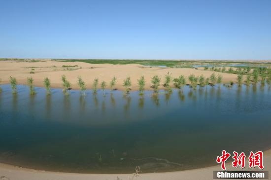 7月24日,引自黃河的凌水讓沙漠上充滿生機。據(jù)悉,中國第七大沙漠--庫布齊沙漠所處的杭錦旗境內(nèi),每年過境水量310億立方米,當?shù)匾荒耆忠坏臅r間都是凌汛期。政府因地制宜,2016年投資建成分凌引水渠、生態(tài)圍堤等設(shè)施,自2016年至2018年黃河凌汛期以來,累計分凌5千余萬立方米,形成約36平方公里保護濕地的面積,原來為沙漠的地貌逐漸變成綠洲,農(nóng)牧民開始發(fā)展野牛養(yǎng)殖與農(nóng)家樂旅游業(yè)。中新社記者劉文華攝