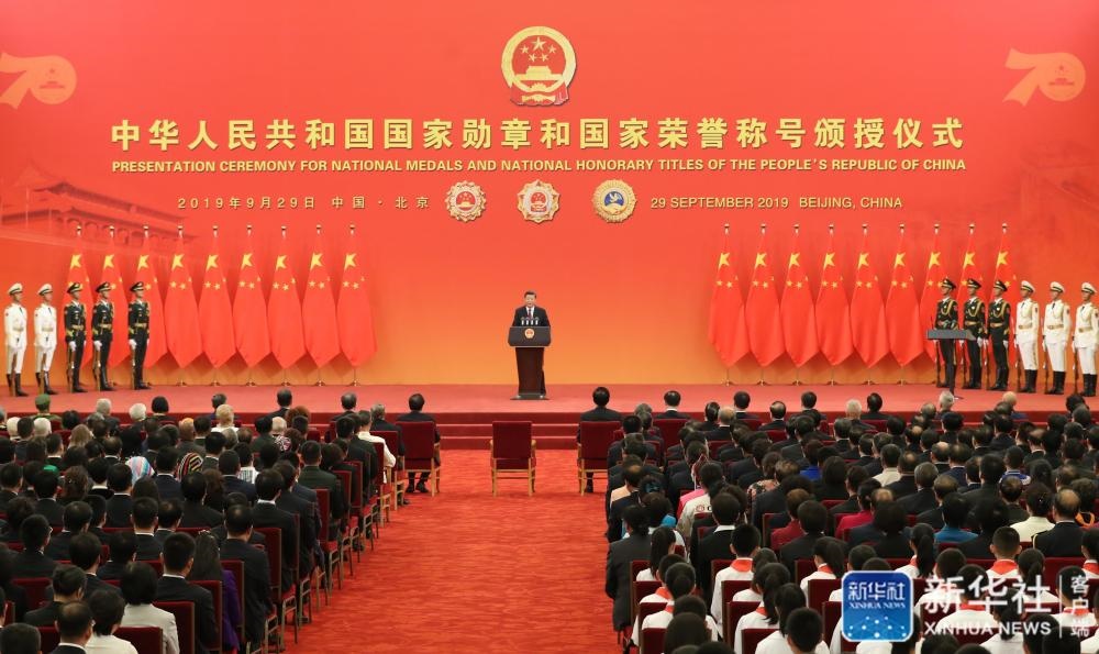 ↑9月29日,中華人民共和國(guó)國(guó)家勛章和國(guó)家榮譽(yù)稱號(hào)頒授儀式在北京人民大會(huì)堂金色大廳隆重舉行。中共中央總書記、國(guó)家主席、中央軍委主席習(xí)近平向國(guó)家勛章和國(guó)家榮譽(yù)稱號(hào)獲得者頒授勛章獎(jiǎng)?wù)虏l(fā)表重要講話。新華社記者鞠鵬攝