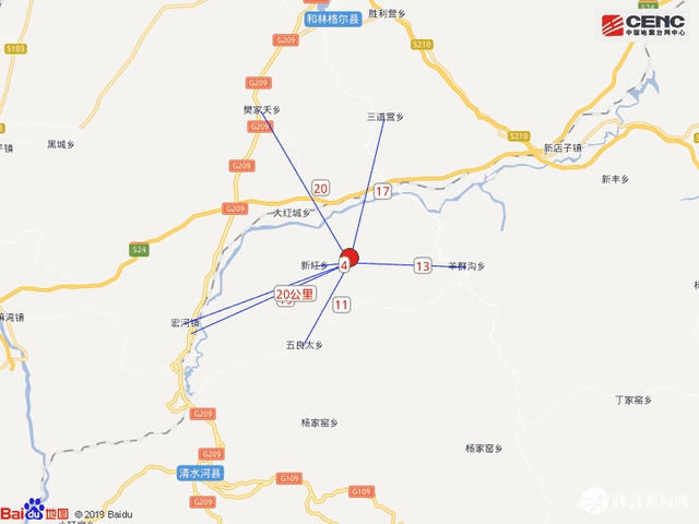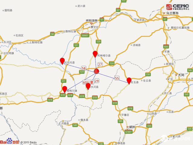 震中距和林格爾縣27公里、距清水河縣29公里、距山西右玉縣55公里、距托克托縣58公里、距準格爾旗60公里,距呼和浩特市76公里?! ?/p>