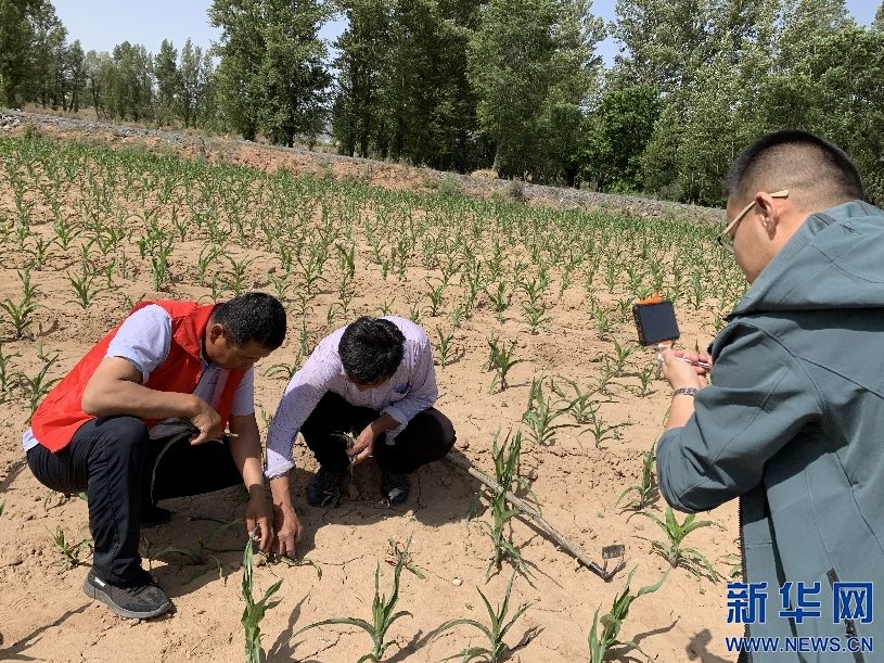 6月10日,內(nèi)蒙古自治區(qū)烏審旗無(wú)定河鎮(zhèn)農(nóng)業(yè)“土專家”在玉米地里針對(duì)小地老虎病蟲害問(wèn)題,進(jìn)行線上直播,向當(dāng)?shù)剞r(nóng)民講解防治方法。新華網(wǎng)曹楨攝