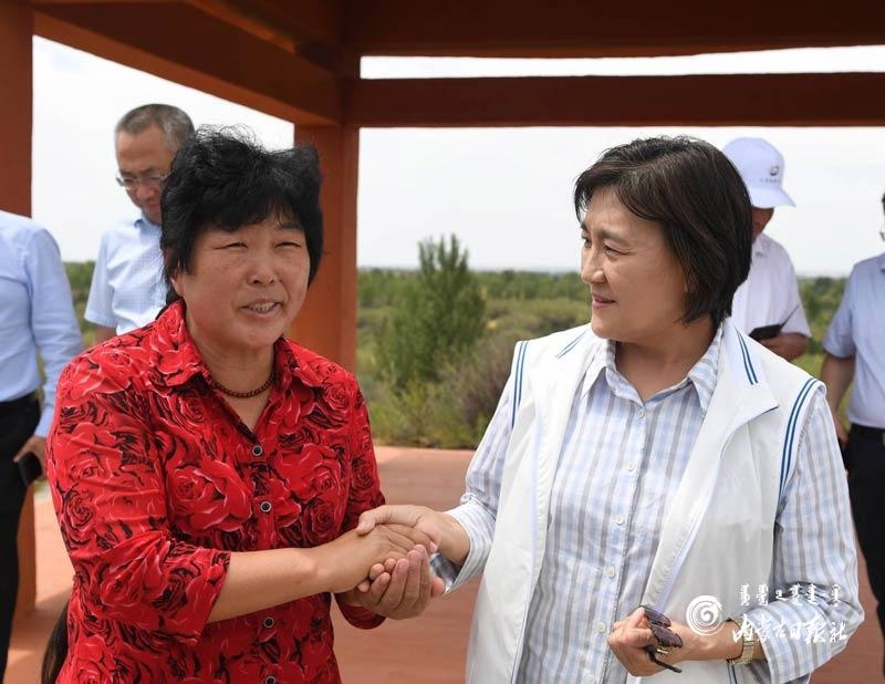 烏蘭陶勒蓋治沙站位于烏審旗毛烏素沙地腹部,建站40多年來,以治沙造林、保護(hù)森林資源為己任,一代接著一代干,防沙治沙工作取得了明顯成效。布小林來到烏蘭陶勒蓋治沙站,調(diào)研治沙造林工作,并與全國“三八·綠色獎?wù)隆鲍@得者殷玉珍親切交流,對當(dāng)?shù)厣鷳B(tài)治理的模式和成效給予肯定。她還來到伊金霍洛旗紅慶河鎮(zhèn),考察鄉(xiāng)村治理、消費(fèi)扶貧等工作。
