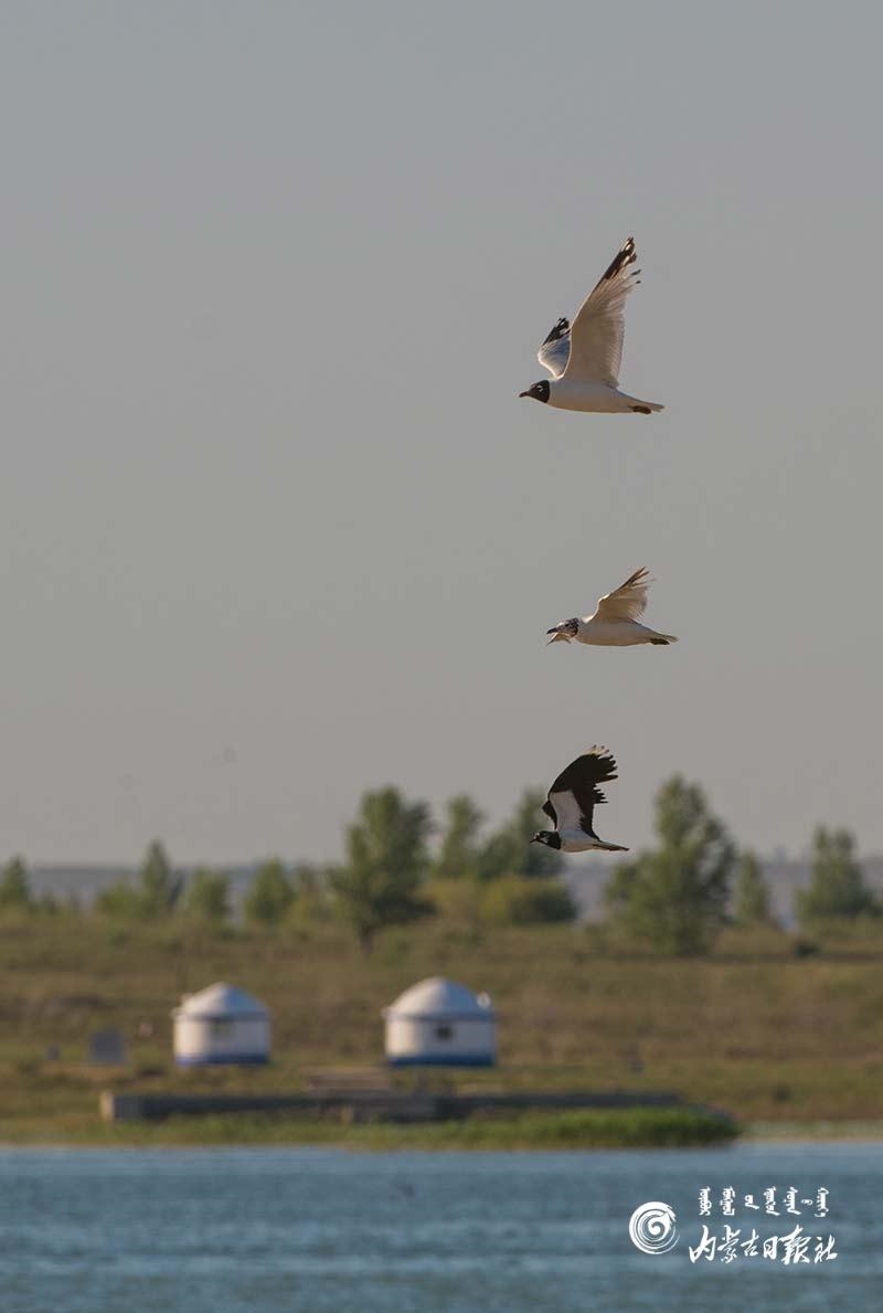 遺鷗掠過水面,與遠處的蒙古包相映成趣。