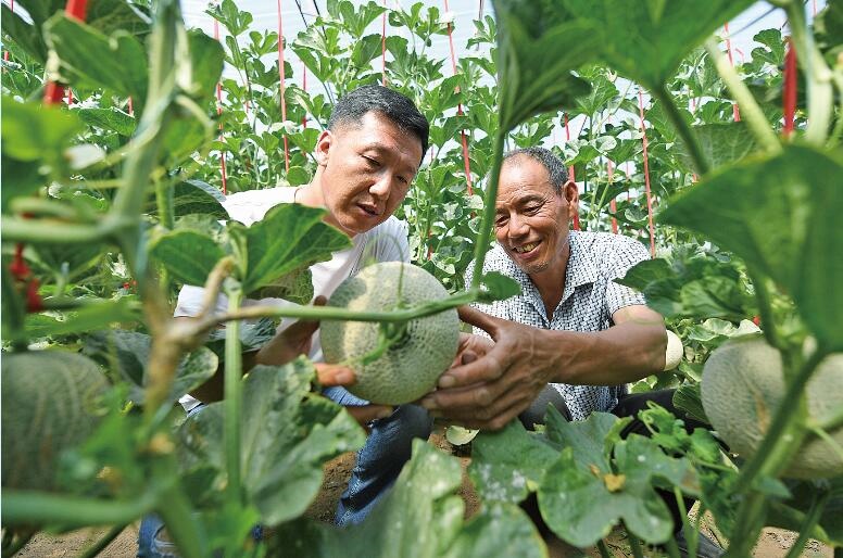 2020年7月,呼和浩特市賽罕區(qū)黃合少鎮(zhèn)賽音不浪村建立網(wǎng)紋瓜種植基地,科技特 派員 李國(guó) 慶(左)向種植戶(hù)提供技術(shù)、種子,采取訂單銷(xiāo)售,帶領(lǐng)村民致富。