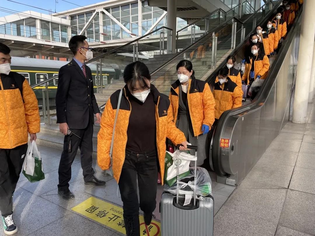 15時,車站工作人員引導(dǎo)醫(yī)務(wù)人員快速通過專用通道,開始登車。