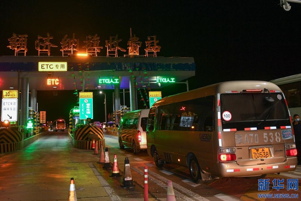 10月29日,滯留在額濟(jì)納旗的旅游包車有序通過額濟(jì)納旗收費(fèi)站。新華社記者 貝赫 攝