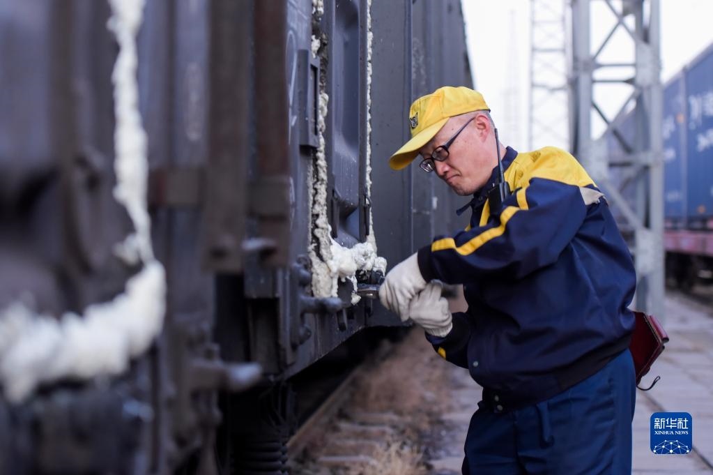 11月23日,在中鐵呼和浩特局包頭西站,工作人員在檢修運煤列車。新華社記者朱文哲攝