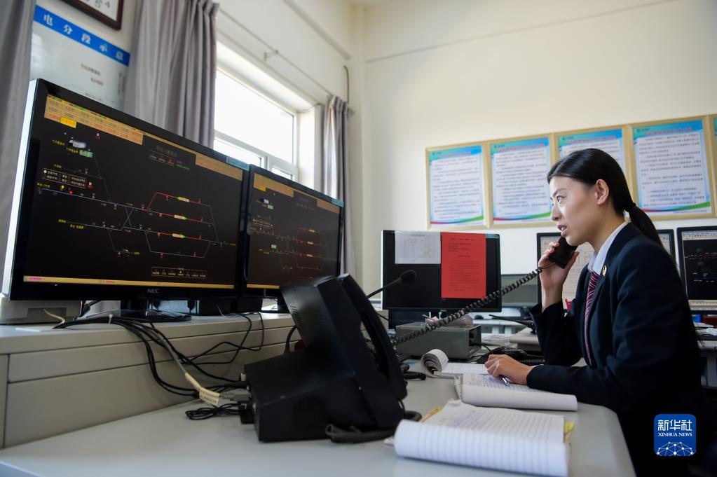 11月23日,在位于鄂爾多斯市的淮河能源西部煤電集團(tuán)色連二礦罕臺川集裝站,工作人員在調(diào)度運煤列車。新華社記者朱文哲攝