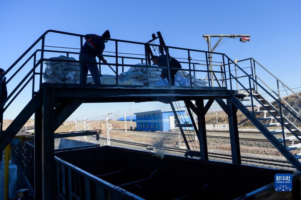 11月23日,在位于鄂爾多斯市的淮河能源西部煤電集團(tuán)色連二礦罕臺川集裝站,工作人員在給運煤列車鋪撒防凍粉。新華社記者李志鵬攝