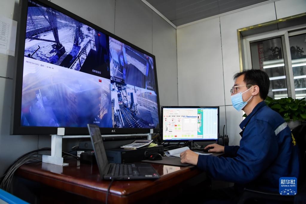 11月23日,在位于鄂爾多斯市的淮河能源西部煤電集團(tuán)色連二礦罕臺川集裝站,工作人員在監(jiān)控裝煤設(shè)備運行情況。新華社記者李志鵬攝