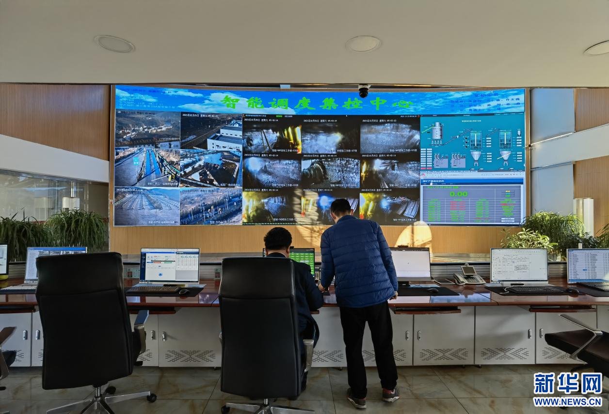 麻地梁煤礦地面智能調(diào)度集控中心的大屏幕上,可以實時查看煤礦各個生產(chǎn)環(huán)節(jié)的狀況。新華網(wǎng) 楊騰格爾攝